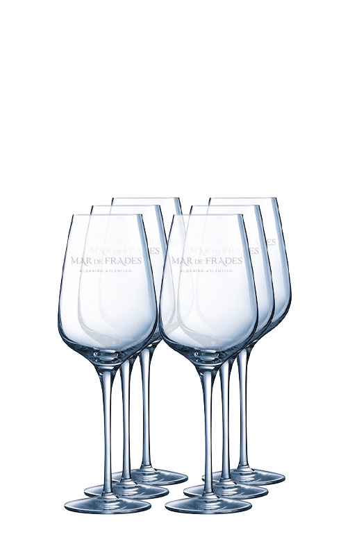 Verres en cristal de grande qualité avec le logo Mar de Frades sérigraphié. Leur contenance est de 45 cl et leur hauteur de 25 cm. Vous vivrez la même expérience qu'un professionnel lorsque vous les utiliserez.