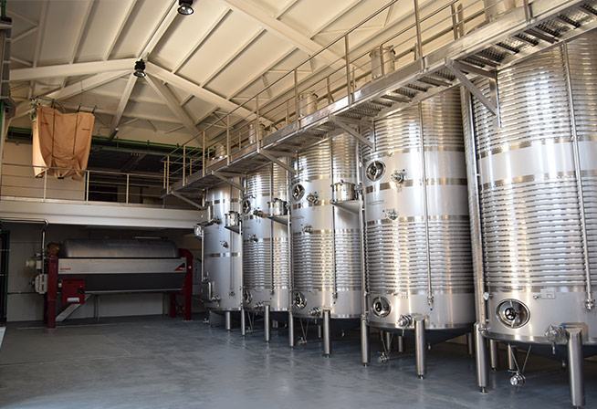 En la nave de elaboración se encuentran los siempre presentes depósitos de acero inoxidable para la fermentación de los mostos, pero cabe destacar que han optado por depósitos de 7500 litros, para trabajar con pequeños volúmenes y hacer una selección de parcela, de manera que se pueda guardar el carácter de cada una antes de la fermentación.