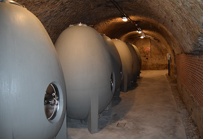 Una vez el desborre hecho, el mosto se conduce por gravedad al “subsuelo”, sin utilización de bombas. Los túneles de la cueva albergan tanques ovoides de hormigón para los trabajos de lías que darán volumen y redondez a sus vinos, barricas de roble francés que les dotarán de complejidad y foudres ovoides de roble (como en Alsacia). Es aquí realmente donde se desarrolla la excepcionalidad del trabajo de esta bodega: Fermentaciones sin utilizar frío y energía. Un proceso lento de elaboración y de envejecimiento bajo tierra que va dar todo su encanto a sus vinos.