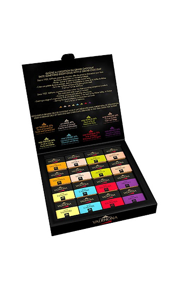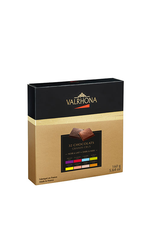 Coffret comprenant 32 carrés de Grands Crus, dans un format idéal pour découvrir la gamme de saveurs Valrhona et les Grands Crus de chocolat noir et de chocolat au lait. De par leur taille et leur présentation, ces carrés sont parfaits pour accompagner un café après le repas. Ce coffret est particulièrement intéressant car il permet de découvrir les nuances offertes par les différents cacaos d'origine avec lesquels travaille Valrhona : Abinao 85 %, Guanaja 70 %, Caraïbe 66 %, Alpaco 66 %, Taïnori 64 %, Manjari 64 %, Jivara 40 % et Tanariva 33 %.