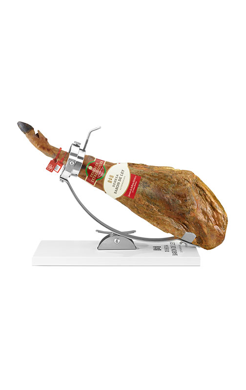 Le jambon ibérique de Dehesa Barón de Ley est séché pendant 48 mois à 900 mètres d'altitude, au cœur de la montagne. Issu de porcs de race ibérique à 75%, nourris de glands et d'herbe, il se distingue par sa forme mince et allongée. Coupé « en V » (marque distinctive sur la peau de la partie inférieure du jambon), il déploie une couleur qui va du rose au rouge intense, avec des infiltrations de graisse particulièrement savoureuses, d'aspect brillant et fluide. De texture peu fibreuse, il vous séduira par ses arômes riches en nuances et en saveurs.