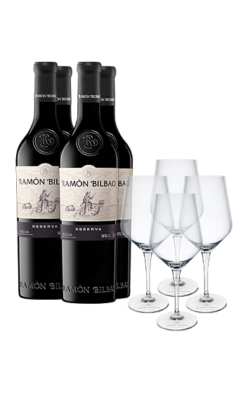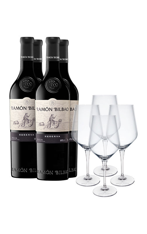 Estuche Ramón Bilbao Reserva 2018 (x4) con copas de regalo (x4)